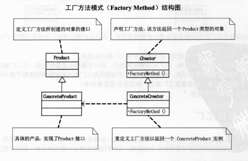在工厂方法模式中,工厂方法用来创建客户所需要的产品,同时还向客户隐藏了哪种具体产品类将被实例化这一细节,用户只需要关心所需产品对应的工厂,无须关心创建细节,甚至无须知道具体产品类的类名。