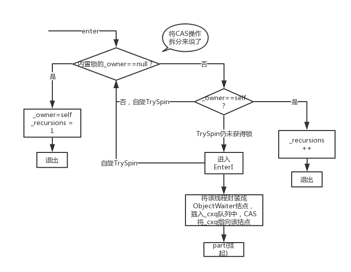 // 通过自旋执行ObjectMonitor::EnterI方法等待锁的释放