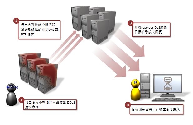 传送给受害目标的响应可能远远大于伪造的请求,这就是这类攻击被称为“放大攻击”的原因。经过精心设计,攻击者可以利用有限的资源,有效的扩大DDOS攻击的流量。