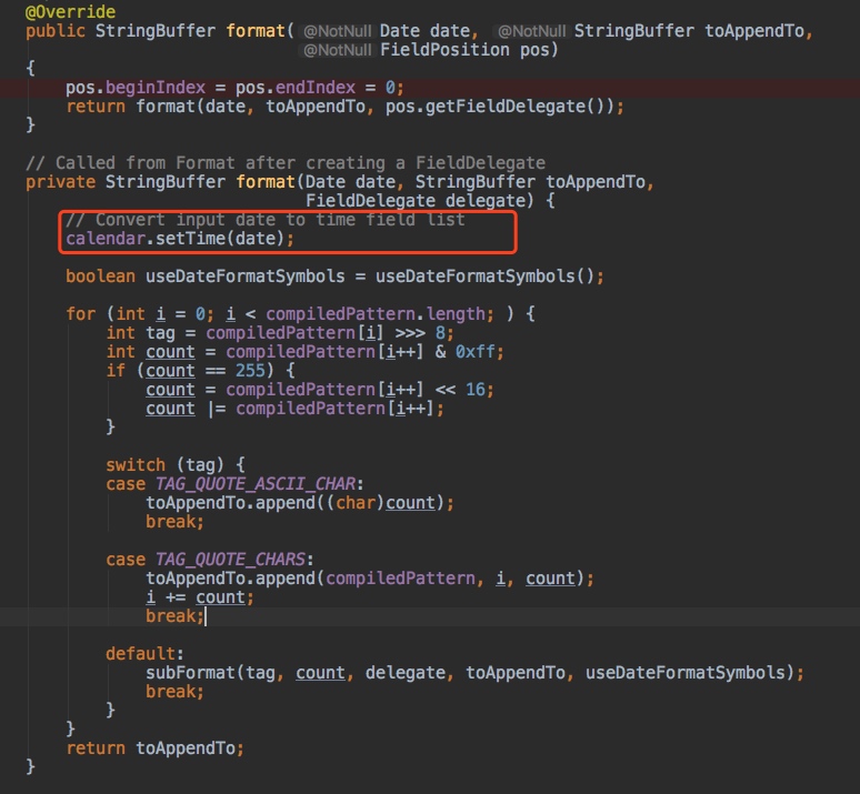 我们跟一下SimpleDateFormat类中format方法的实现其实就能发现端倪。
