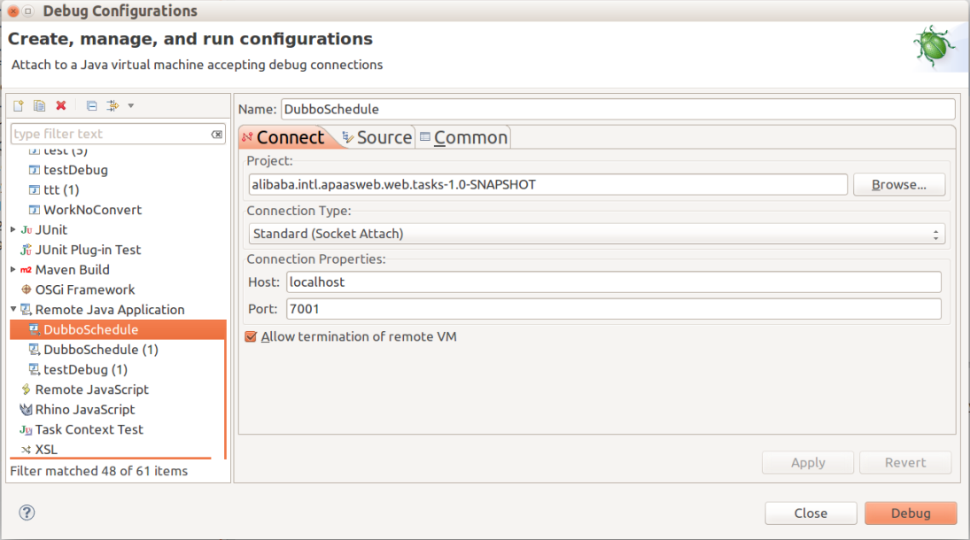 选项。如果希望可以终止连接的 VM,则选择该选项。现在,在选择 Debug