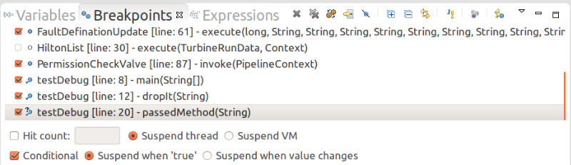 Conditional:顾名思义,就是条件判断,例如我们需要循环变量i==10时,线程挂起,则条件设定为i==10,选择Suspend when "true"。