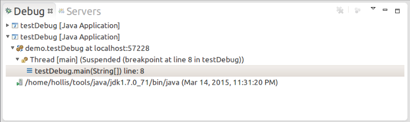 Eclipse通过Suspend与Resume来支持线程的暂挂与恢复。一般来讲,Suspend适用于多线程程序的调试,当需要查看某一个线程的堆栈帧及变量值时,我们可以通过Suspend命令将该线程暂挂。Resume用于恢复。有两种Resume需要注意:第一是当在调试过程中修改程序代码,然后保存,点击Resume,此时程序会暂挂于断点。第二是当程序抛出异常时,运行Resume,程序也会暂挂于断点。