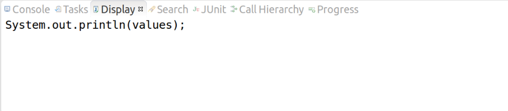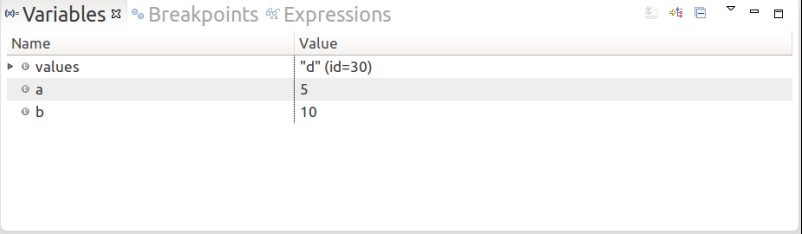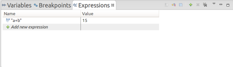 要在 Debug 透视图的编辑器中求表达式的值,选中设置有断点的一整行,并在上下文菜单中选择 Inspect 选项。表达式是在当前堆栈帧的上下文中求值的,其结果显示在 Display 窗口的 Expressions 视图中。 比如我想要计算变量a+b的值,那么就可以在表达式视图中加一个表达式:a+b